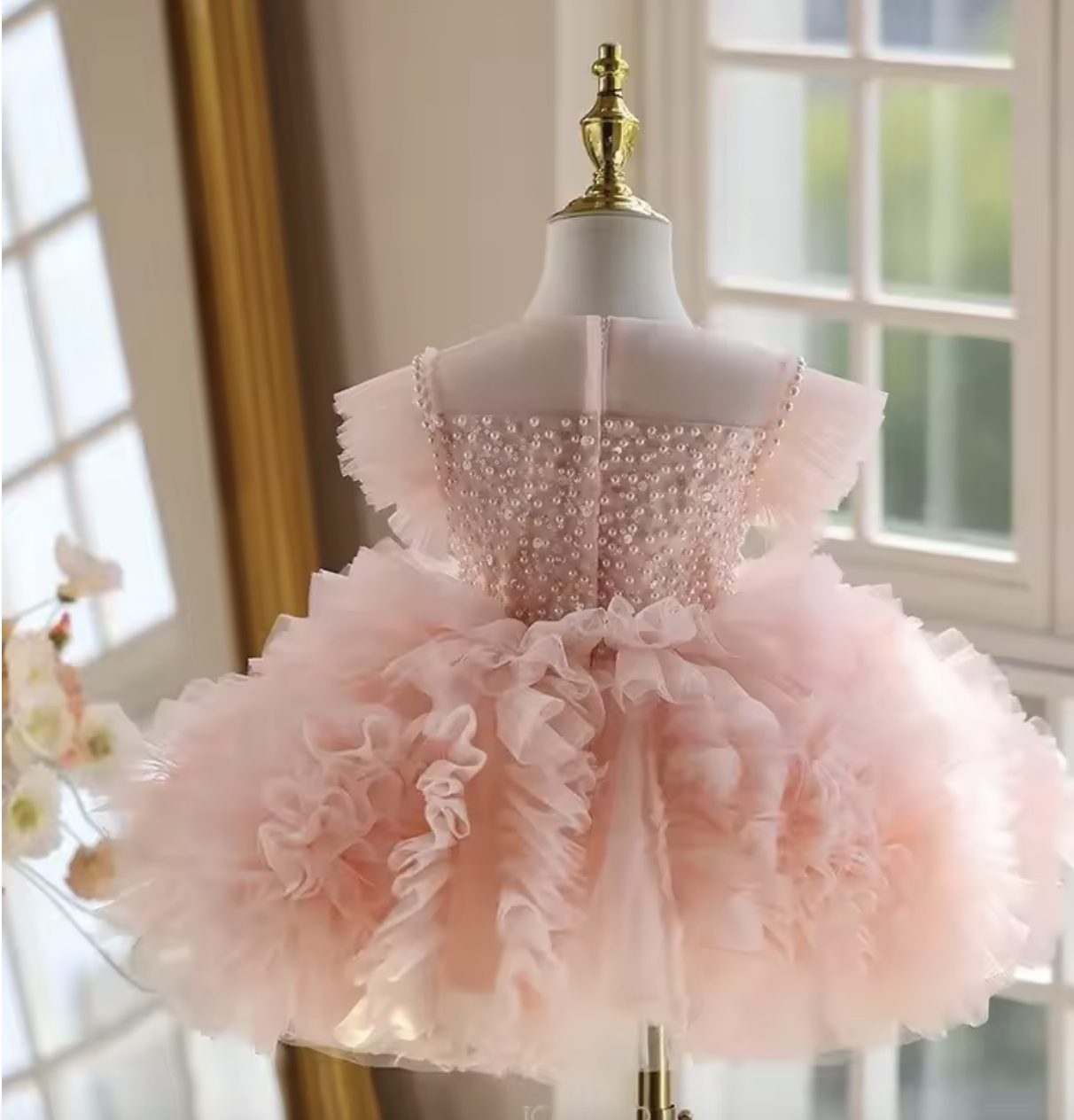 Abundantly layered with fluffy tulle and shimmering details, this pink flower girl dress is truly a showstopper. The glittering bodice, covered in sparkling sequins, perfectly complements the playful, voluminous skirt. The layered ruffles add texture, depth, and drama, making this dress ideal for formal celebrations and ceremonies. Comfortable and elegant, the lightweight design allows the flower girl to move effortlessly while exuding undeniable charm. The sweet blush tone is versatile, harmonizing seamlessly with any wedding or party theme. With an easy-to-wear design and dazzling appearance,this dress combines function with flair, ensuring your little one shines on her special day.